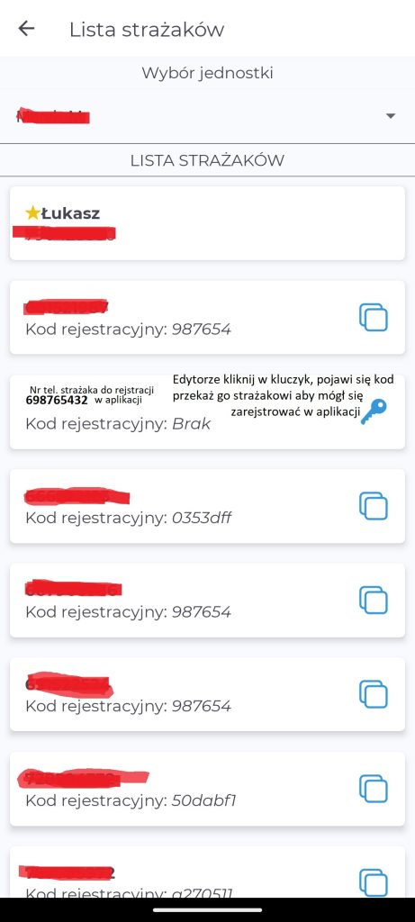 Kod rejestracyjny dla edytora to 987654, dla pozostałych strażaków kod musi wygenerować zarejestrowany edytor w panelu edytora, który jest dostępny w menu z lewej strony ekranu. Edytor musi nacisnąć ikonkę klucza przy numerze dla którego chce wygenerować kod. Instrukcja poniżej.